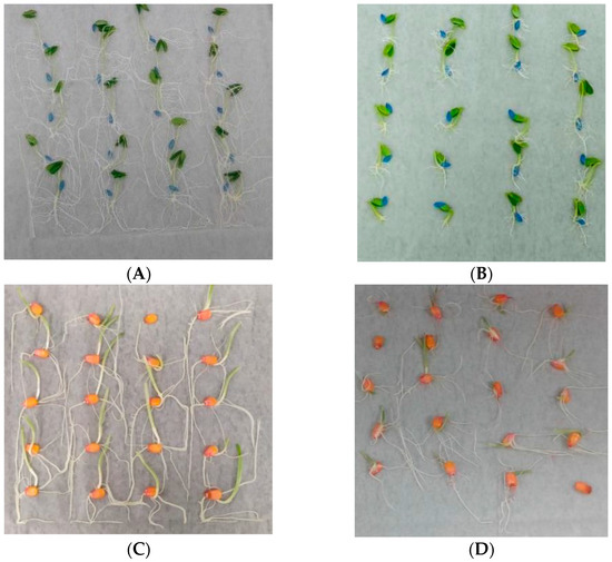Seedlings of (A) cucumber germinated with TMX solution after treatment via the photoelectro-Fenton T4 process; (B) cucumber germinated with untreated (contaminated) TMX solution; (C) maize germinated with TMX solution after treatment via photoelectro-Fenton T4 process; (D) maize germinated with untreated (contaminated) TMX solution.