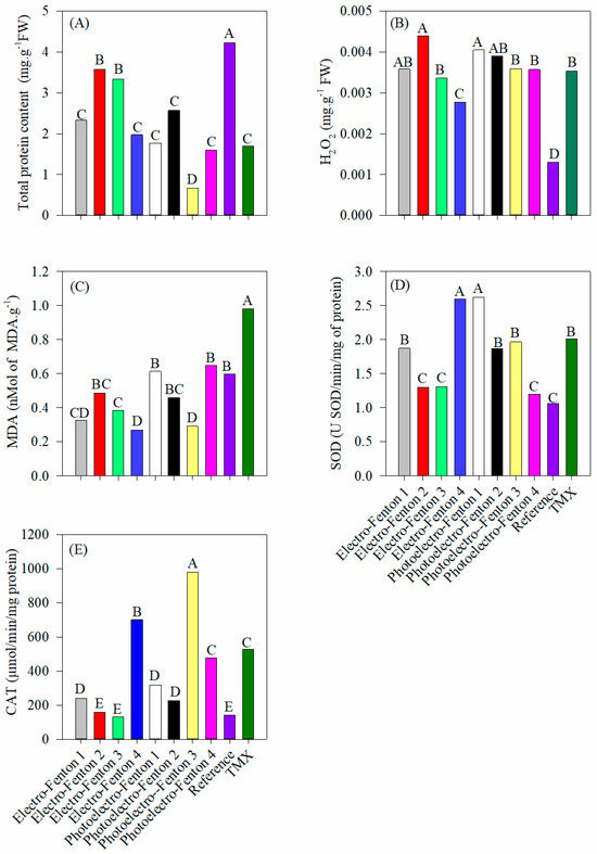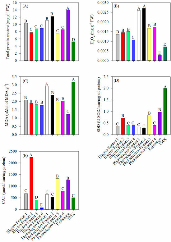 Phytotoxicological analyses of cucumber seeds germinated in the presence of the final solution collected after each treatment applied. (A) Total protein content, (B) hydrogen peroxide content, (C) lipid peroxidation (MDA), (D) superoxide dismutase (SOD) activity, and (E) catalase activity (CAT). Reference test: support electrolyte, without TMX. Contaminated test: 100 mg L−1 of TMX from Actara® (no treatment). Equal letters on the bars indicate that there is no significant difference, and different letters indicate that there is a significant difference between the groups (p < 0.05) according to Tukey’s test at 5% significance.