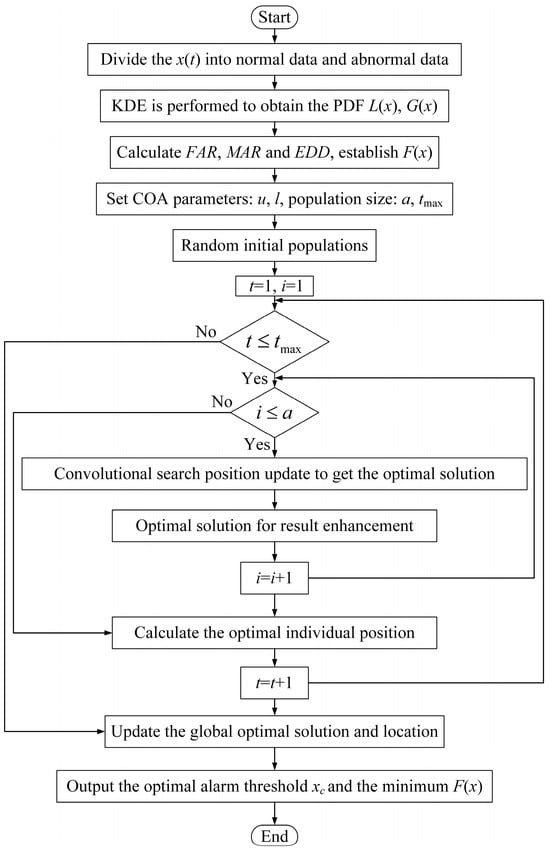 In order to find the optimal alarm threshold, the proposed threshold optimization method in this paper takes into account the FAR, MAR, and EDD. With the FAR, MAR, and EDD as optimization indicators, an alarm threshold optimization objective function is established, and the objective is to minimize the objective function using the COA for optimization calculation, thereby obtaining the optimal alarm threshold xc. The flowchart of the threshold optimization algorithm is shown in Figure 3, the pseudocode is shown in Algorithm 1, and the objective function can be represented as follows: