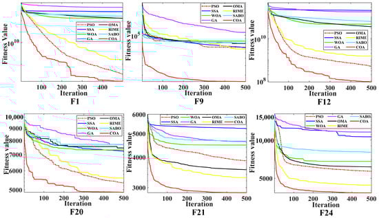 In order to fully evaluate the performance of the COA, this paper compared it with seven intelligent optimization algorithms, including the subtraction-based averaging optimization (SABO) [], optical microscope algorithm (OMA) [], rimmed ice optimization (RIME) [], as well as the classical genetic algorithm (GA), particle swarm optimization (PSO), whale optimization algorithm (WOA), and sparrow search optimization algorithm (SSA). The experimental dataset consisted of 12 test functions from the CEC 2017 benchmark. To make sure that the experiments are fair, the population size for all the algorithms was set to 20, the maximum number of iterations was set to 500, and the dimensionality was set to 100. Moreover, each algorithm was run five times separately, and the average value was taken as the final result to reduce random errors.