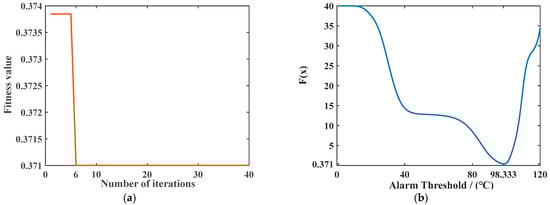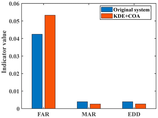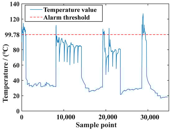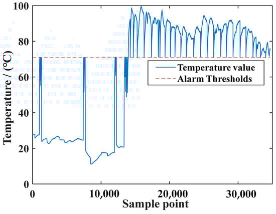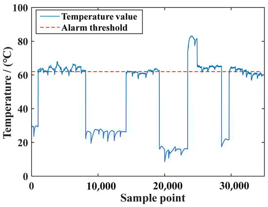 From Figure 9, it is evident that the system experienced a fault at sample point 13,967, after which the temperature remained above the alarm threshold set in the original system. Subsequently, the threshold optimization method proposed in this paper was applied to optimize the alarm thresholds of the original system. The optimized results were then compared with the optimization indicator results under the original system’s alarm thresholds, where the FAR* = 0.02, MAR* = 0.002, and EDD* = 0.002. The comparative results are presented in Table 4.