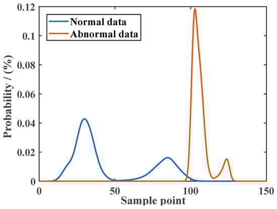 For a univariate alarm system, one of the most critical performance metrics is accuracy, which can be evaluated using metrics such as FAR and MAR []. FAR refers to the probability of the system issuing an alarm signal when the process variable is operating normally. A high FAR can increase the number of alarms, significantly impacting the judgment and efficiency of the operators. MAR denotes the probability that the alarm system fails to respond with an alarm when the process variable experiences an anomaly. A high MAR can increase the potential risk of equipment failure, posing serious safety hazards to production. Therefore, the index value of FAR and MAR can reflect the performance of the designed alarm system. In alarm systems, FAR and MAR are inversely related, and this contradictory relationship is reflected in the receiver operating characteristic (ROC) curve, as shown in Figure 1. Assuming a process variable x(t) with known PDF for normal and abnormal operating conditions, PDF curve distributions for normal and fault data can be obtained, as shown in Figure 2. Here, the solid line represents the PDF curve distribution of normal operating condition data , while the dashed line represents the PDF curve distribution of abnormal operating condition data .