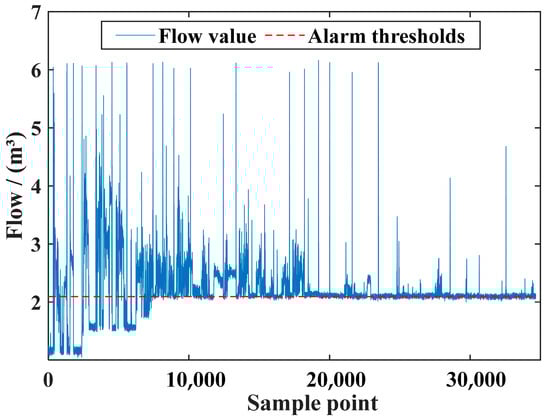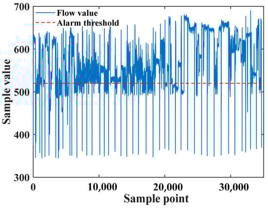 To validate the suppression capability of nuisance alarms during the normal operation of a 1000 WM USCTPU using the proposed adaptive alarm delay method, the reheat desuperheating water flow data in a 1000 MW-level secondary reheat ultra-supercritical DC boiler system were selected as the research subject, with its operational curve depicted in Figure 12. It can be observed from Figure 12 that the flow data contain numerous sample values fluctuating around the alarm threshold. Whenever the sample values of the flow data fluctuate below the alarm threshold, an alarm is triggered, leading to repetitive alarm signals, known as nuisance alarms. These alarms are often not caused by variable anomalies but rather by strong correlations among alarm variables, with the repeated occurrence of alarm signals potentially influenced by other parameters rather than indicating a malfunction. Upon statistical analysis, the original number of alarms reached 1647.