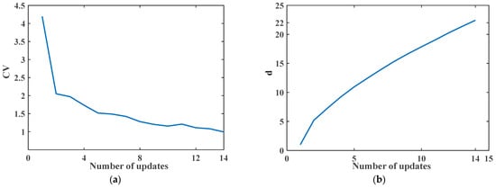 From Figure 13a, it can be seen that the value of the CV is 0.994 after the 14th update, which is less than the CVst. This indicates that the setting of the delay factor is reasonable at this point, and the algorithm meets the stopping update condition. Figure 13b shows that the optimal delay factor after the optimization using the alarm adaptive delay method is d = 22.