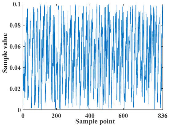 The real-time operational data of the high-pressure main steam temperature from a 1000 MW-level secondary reheating ultra-supercritical direct current boiler system were taken as the research subject. The sampling frequency was set at 1 s, and 9.5 h of real-time operational data were collected. Among them, the alarm threshold is 556 °C. The real-time operational data curve is depicted in Figure 10.