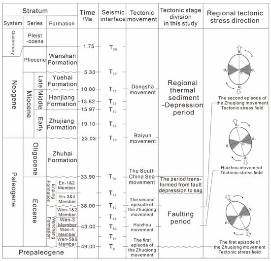 - Hu, Y.; Wu, Z.; Zhong, Z.; Zhang, J.; Yu, W.; Wang, G.; Liu, Y.; Wang, S. Characterization and genesis of the middle and late Eocene tectonic changes in Zhu 1 depression of Pearl River Mouth basin. Oil Gas Geol. 2016, 37, 779–785, (In Chinese with English Abstract). [Google Scholar]