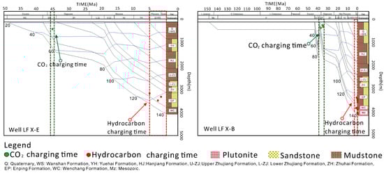 - The oil and gas charging time of the Wenchang–Enping Formation in the steep slope zone of the Lufeng Depression is relatively late, and only the first phase of 5-0 ma oil and gas charging has been found. However, the CO2 charging time in the steep slope zone is earlier, mainly between 35–40 MA. As a result, the reservoir has been modified by an inorganic-organic acidic fluid before oil and gas charging. According to the analysis of the critical moments of hydrocarbon accumulation and the dominant sedimentary facies zones, it is concluded that the fan delta front of well LF X-D and the deep layer of LF Y may have better conditions for hydrocarbon accumulation and preservation, which is a favourable area for the development of the steep slope zone in the Lufeng Depression.