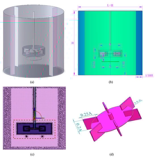 (a) Computational domain. (b) Schematic diagram of the stirred tank. (c) Structured grid. (d) Rushton turbine.