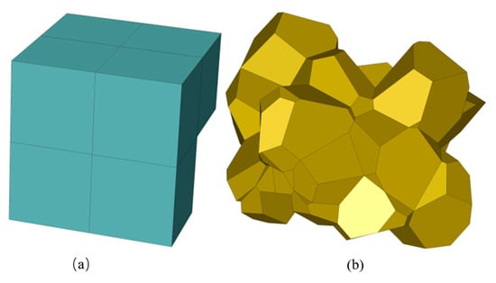 This study employed Fluent 14.5 Meshing software to mesh the geometric model using a poly-hexcore mesh type. Figure 2 displays two distinct types of mesh cells: hexcore and polyhedral. In the solution process, the use of hexcore mesh is superior to poly mesh because the computational accuracy of the hexcore mesh will be a little bit higher, but its mesh delineation is more difficult, which easily leads to poor quality for the mesh, whereas the polyhedra mesh delineation is relatively simple and is suitable for dealing with complex geometric regions [22]. The poly-hexcore mesh type adopts a hybrid meshing scheme, which enables hexahedral and polyhedral meshes to realize co-nodal connections, and it adopts hexcore meshing in the core region of the solution and polyhedra meshing in the wall and transition region, which fully combines the advantages of polyhedra meshing and hexcore meshing, effectively improving the quality of the mesh while reducing the number of meshes and reducing the amount of computation [23].