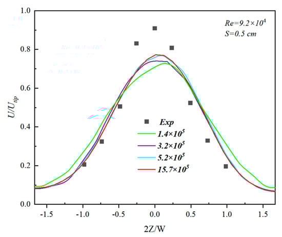 Figure 3 demonstrates the prediction of the axial distribution of the normalized liquid-phase velocity in the discharge zone in the stirred tank for four grid number incremental meshing schemes. There was a bias in the prediction of the velocity at 2Z/W = 0 when the number of grids was 1.4 105. When the number of grid cells increased to 3.2 105, the prediction of the velocity at 2Z/W = 0 was corrected, but the prediction of the maximum velocity was small. When the number of grid cells increased to 5.2 105, the prediction of the liquid-phase velocity was even closer to the experimental results, and when the number of grid cells increased to 15.7 105, the axial normalized liquid-phase velocity distribution did not change much compared with that of the 5.2 105 grid (i.e., increasing the number of grid cells could not improve the computational accuracy effectively). Therefore, the number of grid cells in this study would finally be 5.2 105 after integrating the calculation accuracy and time cost.