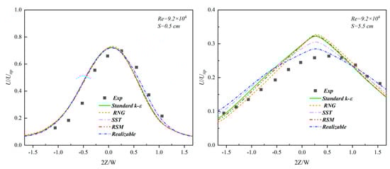 In Figure 4, it is noted that at S = 0.5 cm, the discrepancy in the prediction of liquid-phase velocity among the different turbulence models was negligible, as evidenced by the nearly overlapping curves. The realizable model’s curve subtly shifted to the right for 2Z/W > 0, demonstrating closer alignment with the experimental data. At S = 5.5 cm, while there were noticeable variations in how the turbulence models predicted the liquid-phase velocity, these differences were not markedly significant. The standard k-epsilon, RNG, and RSM models produced almost indistinguishable curves, all slightly overestimating the velocity at 2Z/W = 0.25. Conversely, the SST and realizable models yielded predictions for 2Z/W = 0.25 that better matched the experimental findings, though they tended to slightly overpredict the velocity at 2Z/W < 0.