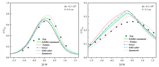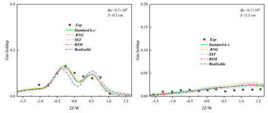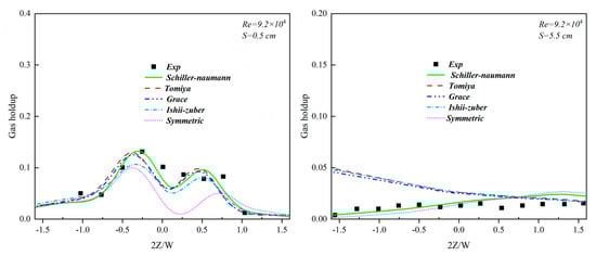 The axial distribution of the liquid-phase velocity, as illustrated in Figure 6 under various drag models, revealed that at S = 0.5 cm, the Schiller–Naumann and symmetric models exceled at predicting the velocity distribution compared with the other models. Specifically, the symmetric model tended to overestimate it at 2Z/W = 0 but delivered superior predictions for 2Z/W > 0. Conversely, the Schiller–Naumann model, while slightly less accurate than the symmetric model at 2Z/W > 0, performed marginally better at 2Z/W = 0. At S = 5.5 cm, both the Schiller–Naumann and symmetric models again showed better predictions for the velocity distribution.