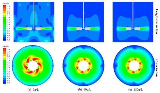 The velocity distribution in the stirred tank with different sulfuric acid concentrations is shown in Figure 8, which shows that the addition of sulfuric acid had a significant effect on the flow field in the stirred tank. Compared with the addition of sulfuric acid, the high-velocity region without sulfuric acid was more widely distributed in the stirred tank, and the flow field was also more intense. From the cross-section, it can also be seen that after the addition of sulfuric acid, the velocity near the wall of the stirred tank was significantly reduced, and the high-velocity region after the impeller was also reduced. The alteration of the sulfuric acid concentration from 60 g/L to 180 g/L resulted in a negligible change, with only a minor reduction in the velocity distribution observed. These phenomena are likely attributable to the increased solution viscosity following the sulfuric acid’s addition, enhancing the impeller resistance and the solution’s internal friction. In general, the addition of sulfuric acid would reduce the stirring range in the stirred tank, affecting the mixing in the stirred tank, but after a certain concentration of sulfuric acid, and then increasing the concentration of sulfuric acid in the flow field in the stirred tank had less of an effect.