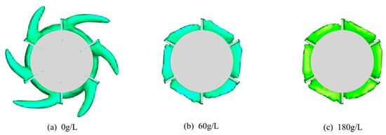 Combined with the 0.018 contour plot of the gas holdup behind the impeller in the stirred tank with different sulfuric acid concentrations in Figure 10, the gas pockets which formed behind the impeller without adding sulfuric acid were more oversized. Most of the oxygen was concentrated in this region, and the other regions in the stirred tank had lower oxygen contents. After adding sulfuric acid, the cavitation which formed at the back of the impeller was reduced. The gas holdup in other areas of the stirred tank also increased, and the oxygen distribution was more uniform. When the sulfuric acid concentration was increased from 60 g/L to 180 g/L, there was no significant change in the cavitation, and the oxygen distribution in the entire area of the stirred tank slightly increased. Regarding the oxygen content, when the sulfuric acid concentration increased from 0 g/L to 60 g/L, the gas holdup of the stirred tank increased from 0.1944% to 0.2017%, an improvement of 3.75%. In comparison, the gas holdup of the sulfuric acid concentration increased from 0.2017% to 0.2019% when the sulfuric acid concentration increased from 60 g/L to 180 g/L, an improvement of only 0.1%.