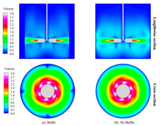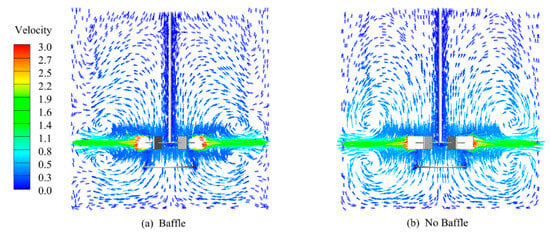 Figure 11 presents velocity vector diagrams of the stirred tank both with and without the baffle plate, illustrating the fluid motion trends. The observations revealed four “vortices” within the stirred tank. Two circulating structures were identified in the upper and lower sections, aligning with the predictions of the numerical simulations reported in the literature [34]. When there was a baffle, the velocity vector distribution on the cloud diagram was denser, and there was a clear tendency for the velocity vector to be upward in the upper half of the region, which was relative to the presence of a greater axial velocity without a baffle. The axial velocity promotes circulating flow within the stirred tank, favorably enhancing the mixing of the upper and lower flow fields. In the absence of a baffle, the radial velocity at the impeller was slightly higher compared with the scenarios with a baffle due to the lack of obstructions.