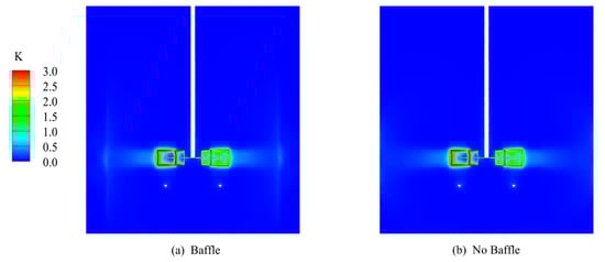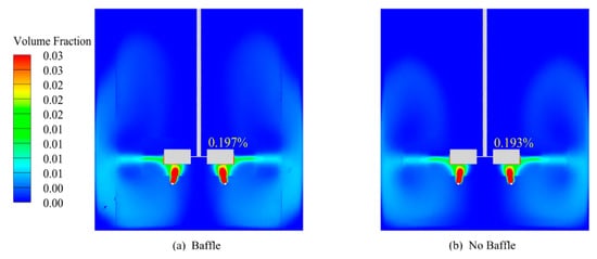 Turbulent kinetic energy signifies the magnitude of the vortex energy within the turbulent flow field. Instability of the velocity field precipitates the generation of turbulent kinetic energy. An increase in turbulent kinetic energy indicates enhanced fluid movement speed and irregularity, signifying instability. Numerous energy-intensive turbulence structures, such as vortices and turbines, possessing high velocity and inertia engender a significant perturbation effect on the surrounding flow field, thereby influencing the macroscopic motion and microstructure of the flow field. As depicted in Figure 15, turbulent kinetic energy within the stirred tank primarily concentrated near the impeller. This region was mainly due to the strong rotation of the impeller disrupting the tank flow field to bring about high turbulent kinetic energy. Secondly, for the addition of the baffle plate in the impeller plane of the baffle plate near the emergence of greater turbulent kinetic energy, this was due to the stirred tank’s fluid impact in the baffle plate produced by the axial radial speeds, destroying the original flow field structure and generating more turbulent kinetic energy. Turbulent kinetic energy caused by the turbulent structure can increase the gas-liquid contact area and promote the dissolution of gas. Figure 16 shows that the gas holdup in the stirred tank was improved, while turbulent kinetic energy could also break the limiting structure of the stirred tank so that the quality of the mixing was uniform. Therefore, considering the impact of turbulent kinetic energy, incorporating a baffle plate is beneficial for enhancing the mixing performance and gas content within a stirred tank.