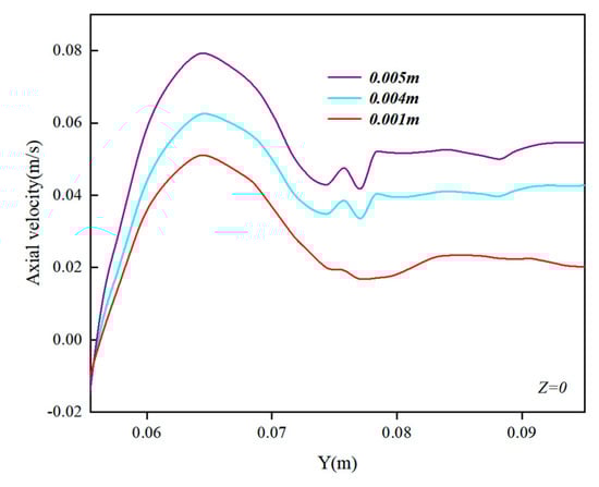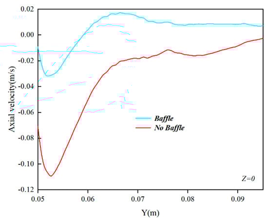 Figure 13 presents a cloud diagram illustrating the velocity distribution in the stirred tank both with and without a baffle. From the longitudinal cross-section, it can be observed that the velocity distribution in the stirred tank without a baffle predominantly concentrated around the impeller plane, forming a confined high-velocity area on both sides of the impeller with a minimal distribution at the top. With the presence of a baffle, the velocity distribution became more widespread, including a notable velocity presence at the top. Introducing a baffle plate expanded the impeller’s stirring range, thereby enhancing the stirred tank’s mixing efficiency. The cross-sectional velocity distribution cloud diagram reveals a trend where the stirred tank’s overall velocity distribution gradually diminished from the center outward. Clearly, the baffle exerted an obstructive effect on the fluid movement, inhibiting the stirred tank’s tangential velocity and creating a low-velocity region behind the baffle, consistent with the phenomena observed in practice. Figure 14 illustrates the axial velocity distribution of the liquid phase in the Y direction at Z = 0 in the stirred tank, comparing the scenarios with and without a baffle. The baffle’s installation notably enhanced the stirred tank’s axial velocity, which benefitted the circulating flow within the tank.