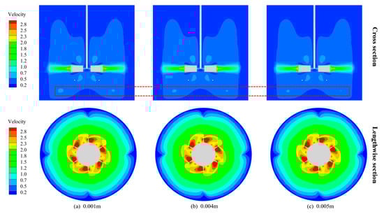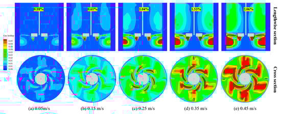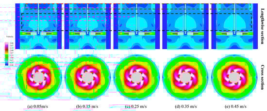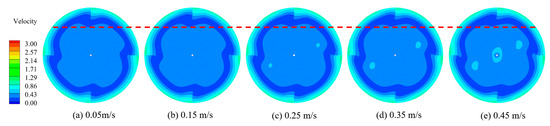 This study investigated the impact of five different inlet velocities—0.05 m/s, 0.15 m/s, 0.25 m/s, 0.35 m/s, and 0.45 m/s—on the flow field within a stirred tank. Figure 16 illustrates cloud diagrams of the velocity distribution inside the tank at varying inlet velocities. Viewed from a vertical cross-section, the effect of the inlet velocity on the flow field can predominantly be observed in the upper half of the tank, where the velocity distribution near the stirring shaft increased with a rising inlet velocity. Furthermore, the dead zones at the top of the stirred tank decreased as the inlet velocity increased, suggesting that an increase in the inlet velocity facilitates a more uniform distribution of velocity within the tank. However, from a horizontal cross-section perspective, changes in the inlet velocity did not appear to affect the velocity distribution within the tank, as indicated by the unchanged cloud diagrams. This phenomenon could stem from the relatively high liquid-phase velocity at the plane of the stirring blades, coupled with the insufficient impact of the minimal inlet velocity not significantly altering the liquid flow within the stirred tank. To validate this perspective, the cross-sectional plane at Z = 0.144 m was examined, as depicted in Figure 17, where the liquid-phase velocity was comparatively low. The illustration confirms that an increase in the inlet velocity indeed modifies the flow field within the tank.