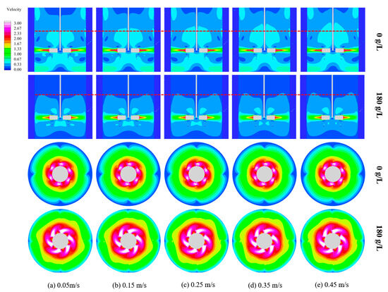 Velocity distribution inside the stirred tank under different concentrations of sulfuric acid.