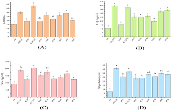 In modulating inflammatory and immunological responses, cytokines are crucial [34]. Cytokines such as TNF-α, IL-6, and IL-1β are also potent immunomodulators for stimulating macrophages [35]. As depicted in Figure 2A–D, the formation of IL-6, IL-1β, TNF-α, and NO was relatively low in the control group but was significantly increased by the LPS group (p < 0.05). The LPS-induced IL-6, IL-1β, TNF-α, NO production of RAW264.7 cells pretreated with the different LAB was significantly lower than that in the LPS group. Furthermore, the levels of IL-1β and TNF-α were lower in AU64 pretreated RAW264.7 cells than those in other LAB pretreated LPS-stimulated RAW264.7 cells. In comparison to other LAB-pretreated LPS-stimulated RAW264.7 cells, AUc2301-pretreated RAW264.7 cells showed lower NO levels. AU41-prepped RAW264.7 cells had lower levels of IL-6 than other pretreated LAB and pretreated LPS groups (p < 0.05).