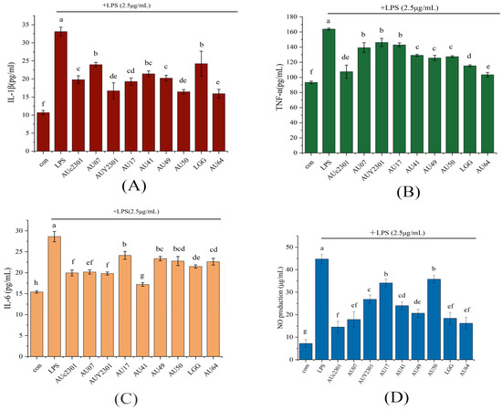 Figure 2. Effect of different strains on the release of IL-1β (A), TNF-α (B), IL-6 (C), and NO (D) of RAW264.7 macrophages activated by LPS. (Data are presented as mean ± SD of three independent experiments (n = 3)). Different letters on the bars indicate significant differences between means at p < 0.05 based on Tukey’s post hoc test.