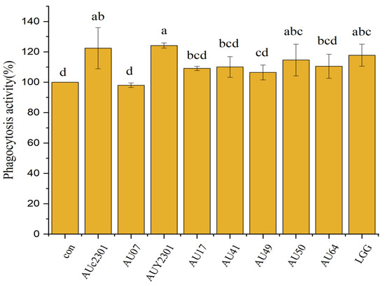 Figure 3. Effect of the selected strains on the phagocytosis of RAW264.7 macrophages. (Data are presented as mean ± SD of three independent experiments (n = 3)). Different letters on the column indicate significant differences between means at p < 0.05 based on Tukey’s post hoc test.