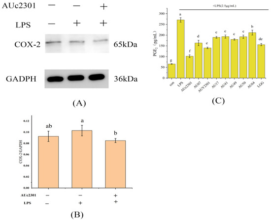 Figure 4. Effect of AUc2301 on expression of COX-2 of RAW264.7 macrophages activated by LPS (A,B). Effect of screened strains on PGE2 release from RAW264.7 macrophages (C). (Data are presented as mean ± SD of three independent experiments (n = 3)). Different letters on the bars indicate significant differences between means at p < 0.05 based on Tukey’s post hoc test.