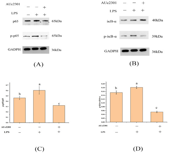 Figure 5. Effect of AUc2301 on the NF-κB activation in RAW264.7 cells activated by LPS. (Data are presented as mean ± SD of three independent experiments (n = 3)). Different letters on the bars indicate significant differences between means at p < 0.05 based on Tukey’s post hoc test). (AC) Effect of AUc2301 on the expression of p65 non-phosphorylated protein in RAW264.7 cells activated by LPS. (BD) Effect of AUc2301 on the expression of IκB non-phosphorylated protein in RAW264.7 cells activated by LPS.