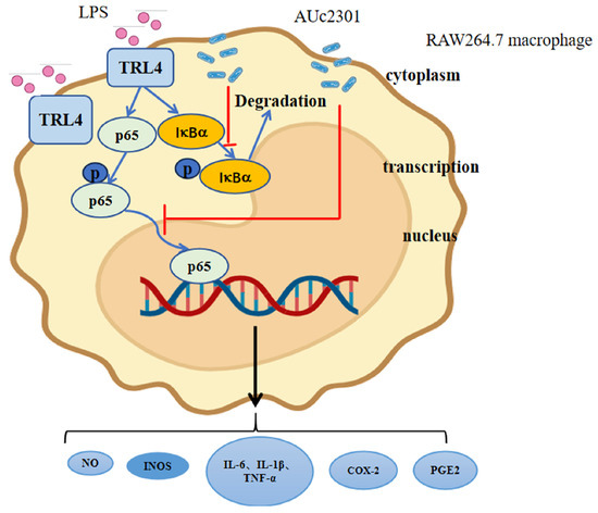 In response to specific stimuli, such as LPS, NF-κB undergoes phosphorylation and translocation into the nucleus to regulate the expression of inflammatory cytokines, including iNOS, NO, COX-2, IL-6, and TNF-α, thus activating the NF-κB signaling pathway. Activation of this pathway involves the phosphorylation and subsequent degradation of IκB, which is a crucial step for NF-κB activation in LPS-activated RAW264.7 cells. In the cytoplasm, the p65/p50 heterodimer, the most common NF-κB dimer, remains bound to an inhibitor of NF-κB (IκBα) and remains inactive. However, LPS stimulation leads to the phosphorylation of both p65 and IκBα, which enhances NF-κB activation during inflammatory processes. NF-κB, located downstream of the TLR4-mediated signaling pathway, is a significant transcription factor that plays an essential role in regulating the immune response [56]. Due to their high molecular mass, the soluble compounds produced by LAB are unable to penetrate cells. Consequently, the initial step in immunomodulation involves binding to TLR4 receptors. This binding activates downstream signaling pathways, such as NF-κB, leading to the secretion and expression of cytokines, including NO, TNF-α, IL-6, IL-10, and IL-1β. These cytokines play a crucial role in regulating the immune system and contribute to the immunomodulatory activity exerted by LAB [57]. The NF-κB signaling pathway acts upstream of cytokine production, including TNF-α and IL-6, and plays a crucial role in regulating the secretion of cytokines. The activation of NF-κB is pivotal in controlling the expression of proinflammatory cytokines. A large number of studies have demonstrated that various pathways can induce NF-κB activation in macrophages, leading to phosphorylation of NF-κB proteins. This phosphorylation triggers their translocation from the cytoplasm to the nucleus, initiating gene transcription [57]. In Figure 6, AUc2301 attenuated the LPS-induced expression of p-p65 protein in RAW264.7 cells, promoted nuclear translocation of p65 and inhibited the degradation of IκB-α. These results indicated that AUc2301 could restrain the production of proinflammatory cytokines, NO, and COX-2 by activating NF-κB signaling pathway (Figure 6).