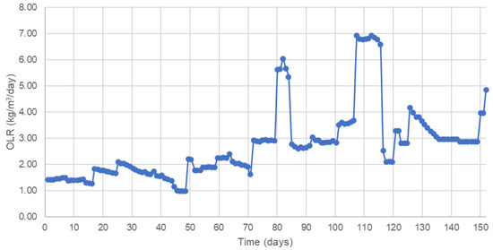 The sharp increase in OLR (see in Figure 2) during the 80th–90th day and 105th–110th day was to test the robustness of the system and its ability to recover from the shock. Since there was a significant increase in the OLR during the said periods, consequentially, a rapid increase in efficiency was noted, as well as a rapid increase in SPB and SPM. However, after said shocks, no irreversible decrease in efficiency was noted, and it can be concluded that sharp increases in OLR are not fatal to the system.