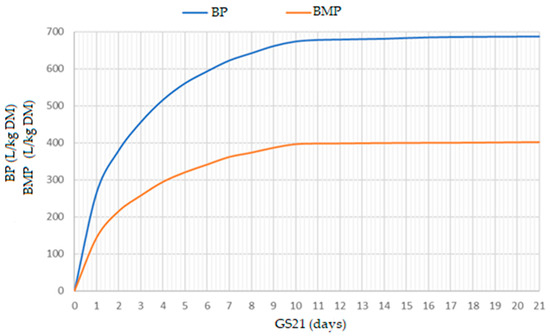 During the determination of the biogas and biomethane potential of pepper samples, the biogas potential of 687 L/kg DM was observed. Also, the biomethane potential of 401 L/kg DM was observed. Said maximal biogas and biomethane potential were achieved on the 10th day of the process (Figure 3).