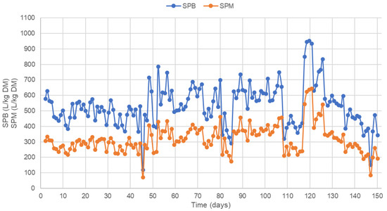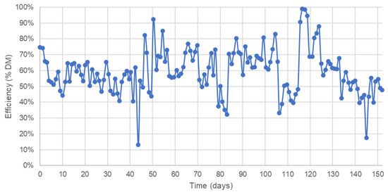 After the continuous anaerobic digestion of pepper samples in the pilot scale was performed, SPB, SPM, as well as efficiency were observed. SPB was between 118 and 934 L/kg DM, while SPM was between 72 and 644 L/kg DM (Figure 4). Efficiency is shown in the graph in Figure 5. Around the 43rd and 145th day, a decline in OLR was performed to test the stability of the system during the circumstances of low organic load. During said period of starvation, SPB and SPM decreased, which is seen from the graph in Figure 4. However, the drop in OLR was not fatal to the system as it fully recovered which is seen from the aftermath increase in efficiency, SPB, and SPM.