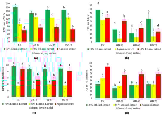 Impacts of various extraction methods on TPC, TFC, and antioxidant activities. (a) Total phenolic content; (b) total flavonoid content; (c) DPPH radical scavenging capacity; (d) ABTS radical scavenging capacity; OD-50/60/70; oven dryer at 50 °C, 60 °C and 70 °C; FR: freeze dryer; GAE: gallic acid equivalent; CE: catechin equivalent. The triplicate mean values of columns with different superscript letters are significantly different (Tukey test; p ˂ 0.05).