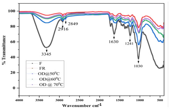 The FTIR analysis illustrated the functional groups present and those lost after drying, as shown in Figure 2. Fresh and dried V. sinaiticum leaves analyzed using FTIR revealed wave numbers (cm−1) with absorbance peaks at 3345 (OH or N-H), 2916 (C-H), 2849 (C-H), 1600 (C=C), 1241 (C-O of acid), and 1030 (C-O of alcohol or phenol), with varying concentrations. The variations in the transmittance of the absorption spectra of fresh V. sinaiticum leaves and samples subjected to drying demonstrated the distinct impact of temperature on the accumulation of biochemicals, as shown in Figure 2, particularly in the oven-dried sample at 70 °C where functional groups were detected.