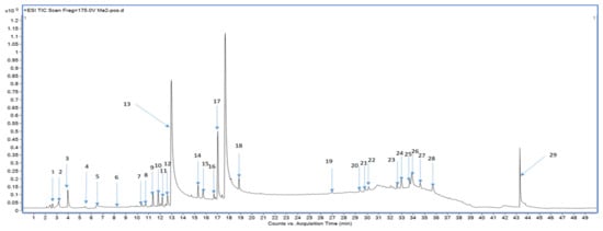 Phytochemicals present in the 70% ethanolic extract of V. sinaiticum leaves were separated and detected using an Agilent 1290 series UHPLC-ESI-QTOF-MS/MS system (Figure 3). A total of 29 metabolites were tentatively identified from the plant extract in positive ionization mode, as shown in Table 4. These compounds are listed along with their retention time, molecular formula, molecular ion m/z in positive ion mode (M ± H), or others and compound assignment.