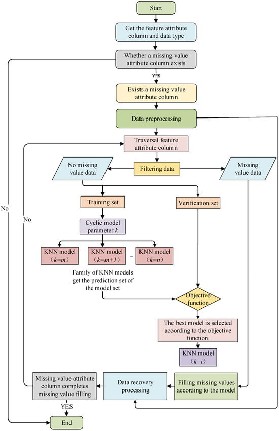 The K-Nearest Neighbor (KNN) classification algorithm is a relatively mature classification method in theory, and it is also a machine learning algorithm. The algorithm utilizes the correlation and similarity of data on different factors to fill in and correct missing values or outliers in data. The concept behind this method is that if a sample has the k most similar samples in the feature space (i.e., the nearest neighbors in the feature space), and a majority of these samples belong to a certain category, then it can be inferred that the sample also belongs to that category. Consequently, the KNN classification algorithm can be employed to automatically fill in default data. The flow chart illustrating the process of default value filling is depicted in Figure 2 [23,24].
