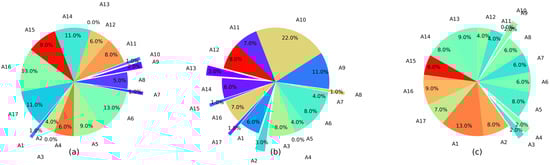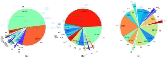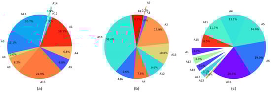 The correlation value between factors and the three abnormal conditions based on the rank correlation analysis. In (a–c), represents different main control factors. For example, represents the actual total number of temporary plugging sections, and denotes the average cluster spacing. For more details, please refer to Table 1.
