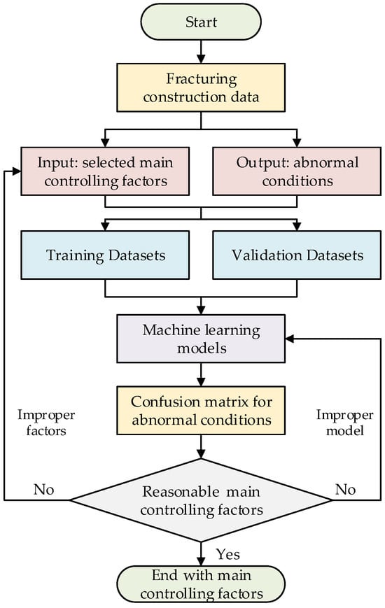 Firstly, taking the abnormal conditions as the output variables and the main controlling factors affecting abnormal conditions as the input variables, a machine learning model was established aimed at predicting the occurrence probability of abnormal conditions. Secondly, the field data were divided into training data with the size of training data set as 0.8, and test data with the size of test data set as 0.2, and then the model was trained and tested based on corresponding data, and consequently obtained multiple training confusing matrices and test confusing matrices for the three typical abnormal conditions. Thirdly, the results in confusing matrices were employed to judge whether the selected main control factors were reasonable. If reasonable, the current main controlling factors were retained for the next step. If it was unreasonable, we analyzed whether the unreasonable reason was improper selection of the main controlling factors or improper selection of models. Finally, according the unreasonable reason, the corresponding experiment was adjusted. If the main controlling factors were improperly selected, the quantitative sorting steps of the main controlling factors in the analysis of abnormal conditions were returned. If the model was improperly selected, the experiment went back to the model selection step in the establishment of the machine learning model [30,31].