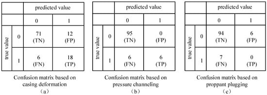 As shown in Figure 7a–c represent the test confusion matrices based on pressure channeling, casing deformation, and proppant plugging obtained by the AdaBoost algorithm, respectively. The test confusion matrix is further explained below. The test confusion matrix in (a) shows that there are 83 observations labeled as 0 where 71 prediction results (TN) are correct and 12 prediction results (FP) are incorrect, while there are 24 observations labeled as 1 where 6 prediction results (FN) are incorrect and 18 prediction results (TP) are correct. Similarly, Figure 7b,c test confusion matrices are also explained in this way. In particular, 0 means that the corresponding abnormal conditions do not occur, and 1 means that the corresponding abnormal conditions occur. Therefore, the accuracy of the verification sets of casing deformation, pressure channeling, and proppant plugging obtained by the AdaBoost algorithm were 83%, 94%, and 88%, respectively.