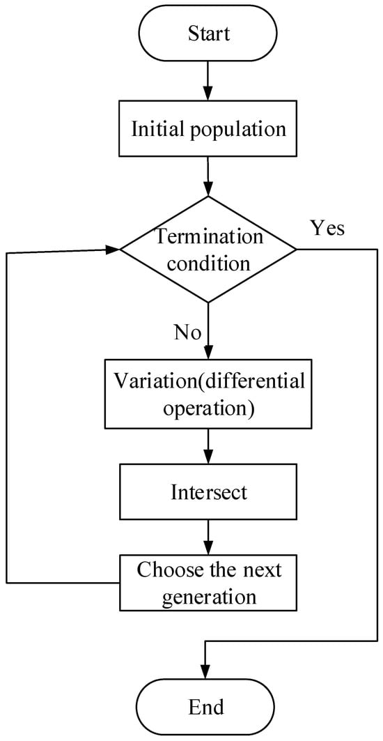 A differential evolution algorithm (DE) is a kind of efficient global optimization algorithm. It is also a heuristic search algorithm based on groups, where each individual in the group corresponds to a solution vector. Now, the DE is widely used to solve complex optimization problems, and has achieved very good results. It simulates the process of biological evolution and generates a set of solutions through continuous evolution in order to find the optimal solution to the problem. The flow chart illustrating the process of a DE is depicted in Figure 9.