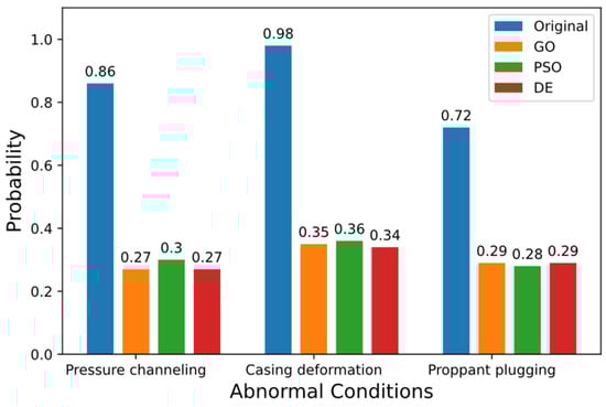According to Table 10, comparing the occurring probability of abnormal conditions before and after optimization, we can conclude the following observations for better understanding the optimization results: First, for wells 1–3, any optimization algorithm (GO, PSO, and DE) can better reduce the probability of occurrence of any abnormal conditions (pressure channeling, casing deformation, and proppant plugging) by the corresponding optimized construction parameters, e.g., the occurring probability of pressure channeling in well 1 reduces from 0.86 to 0.27 under the GO, where , , , , , , and are optimized as , , , , , , and . Second, to avoid pressure channeling in well 1, the GO and DE were more efficient than the PSO algorithm, i.e., the original probability 0.86 was optimized as 0.27 by the GO and DE, while the optimized result of PSO was 0.30; to avoid casing deformation in well 2, the DE was more efficient than the GO and PSO, i.e., the original probability 0.98 was optimized as 0.34 by the DE, while the optimized results of the GO and PSO were 0.35 and 0.36, respectively; to avoid proppant plugging in well 3, the PSO algorithm was more efficient than the GO and DE, i.e., the original probability 0.72 was optimized as 0.28 by PSO, while the optimized result of the GO and DE was 0.29. Third, the average optimization reduction probabilities of the three algorithms, the GO, PSO, and DE, for abnormal conditions were , , and , respectively, which means the PSO algorithm has the most significant optimization effect and the DE has the lowest optimization result in occurring probability.