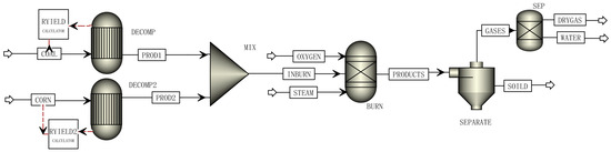 The gasification process is modeled using the following two integrated reactor models: RYIELD and RGIBBS. The RYIELD model converts unconventional coal into conventional components such as H2, N2, O2, S, H2O, Cl2, and ash. The yield distribution of these components is programmed using Fortran, based on the ultimate analysis of biomass and coal. The RGIBBS model, a chemical equilibrium model that utilizes Gibbs free energy minimization, calculates the co-gasification of coal and biomass. Figure 1 depicts the pyrolysis and gasification processes, as modeled in Aspen Plus. Validation of the model is achieved by comparing simulated syngas compositions with engineering data from the literature, as shown in Table 2, demonstrating close agreement and confirming the model’s reliability [21].