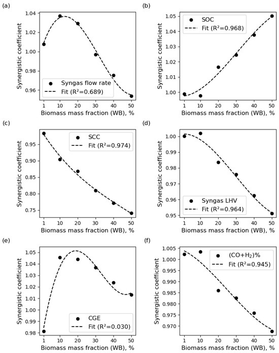 Synergistic coefficients for various performance indicators at different biomass mass fractions: (a) syngas flow rate; (b) syngas yield; (SOC); (c) solid carbon conversion (SCC); (d) syngas lower heating value (LHV); (e) syngas yield (SOC); and (f) CO + H2 concentration.