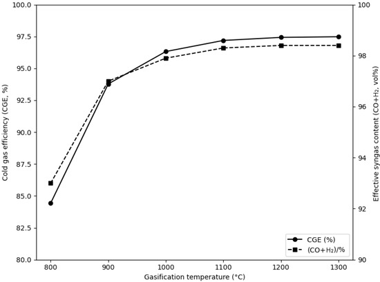 The main evaluation indicators for coal and biomass gasification include specific oxygen consumption, specific coal consumption, syngas lower heating value (LHV), cold gas efficiency, and the content of effective syngas (CO + H2) in the product gas. Cold gas efficiency (CGE, %) is defined as follows [22]: