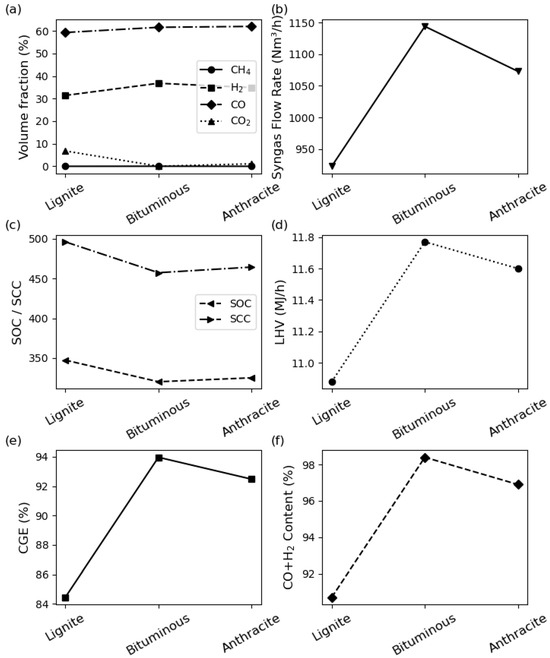 Effect of coal rank on the gasification performance parameters: (a) CH4, H2, CO, and CO2 content in the syngas; (b) sSyngas flow rate; (c) SOC and SCC; (d) LHV of the syngas; (e) CGE of the gasification process; and (f) cCombined CO and H2 content in the syngas.