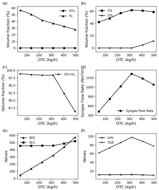 Effect of OTC mass ratio on the gasification performance parameters: (a) CH4 and H2 content in the syngas; (b) CO and CO2 content in the syngas; (c) combined CO and H2 content in the syngas; (d) syngas flow rate; (e) SOC and SCC; and (f) LHV of the syngas and CGE of the gasification process.