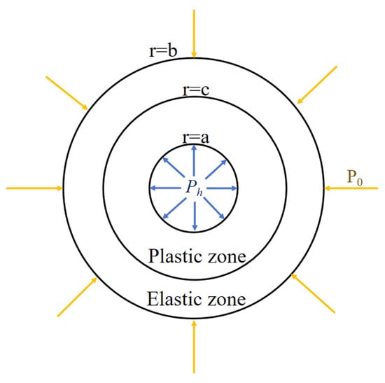 Meanwhile, the damage variable at the boundary is 0, that is, D′ = 0. Since the stresses in the elastic and plastic zones are equal, substituting the stress expression at r = c presented in Equation (15) and D′ = 0 into the strength criterion in Equation (21) yields