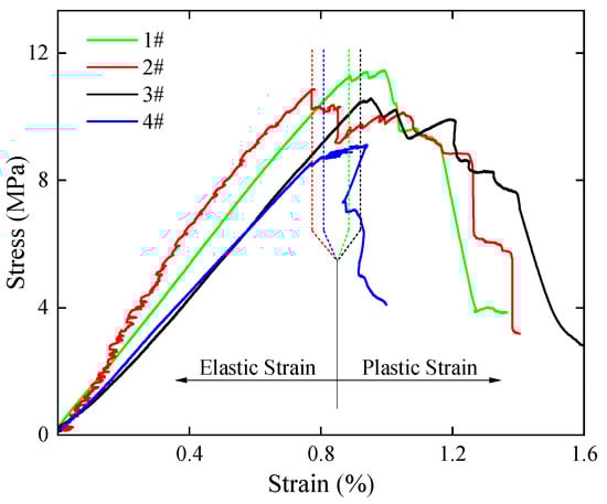 The TAW-2000 electro-hydraulic servo testing machine was employed for uniaxial compression tests with a displacement loading method at a rate of 0.1 mm/min. Axial and radial displacements were measured by an extensometer, and a computer was used to record data on loads, stresses, strains, and displacements during the test. Four experimental groups were set up for the uniaxial experiments, with all samples derived from the same coal seam. The measured mechanical parameters are shown in Table 1, and the stress–strain curves for the four samples are depicted in Figure 2. These curves show some differences, especially the one from sample #4. In fact, coal is a highly heterogeneous rock. It has low material strength and a rich pore structure, which leads to the easy formation of cracks and defects under the influence of strata movement and mining disturbances. These cracks and defects are the reasons for the differences in the stress–strain curves. The trends of curves #1, #2, and #3 are more consistent with the ideal full stress–strain curves of rocks. Sample #4 has natural joint planes, and when the stress reached 9.13 MPa, it underwent large-scale fracturing, causing a sudden change in the curve. The average results of the four tests indicate that the coal body’s modulus of elasticity E = 1820 MPa, Poisson’s ratio μ = 0.32, and uniaxial compressive strength fc = 10.52 MPa, with the hydraulic fracturing drilling radius being 0.047 m.