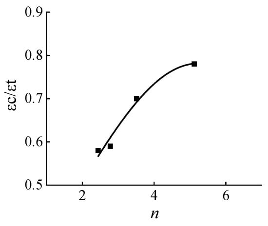 The damage coefficients εc/εt and n have a corresponding relationship in Equation (6), and the constant εt value was obtained by using the method described in reference []. Using MATLAB R2022a, the full stress–strain curve data obtained from the uniaxial compression test were input into the damage constitutive equation to fit the corresponding value of n. Combining the peak strain εc, the εc/εt and n values for the four specimens were statistically analyzed to fit the relationship curve between εc/εt and n, as illustrated in Figure 3.