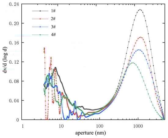 Porosity determination experiments were carried out using the PoreMaster GT-60 mercury intrusion porosimeter (Quantachrome Instruments, Boynton Beach, FL, USA). Samples were collected by carving particles of 1–3 mm in size from the original coal specimens with a knife. The pore volume distribution density function of the four groups of samples is depicted in Figure 5, and the corresponding porosity values are listed in Table 3, with an average porosity of φ = 12.6%.